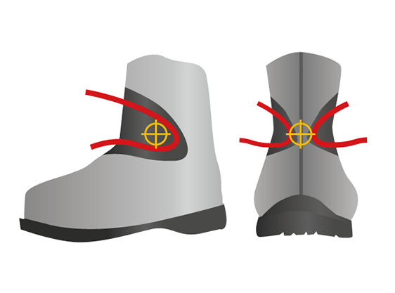 カモシカのひづめを連蔵させる斜めにカットしたダブルヒール構造は、堅牢な登山靴をスムーズに前進させるための革新的なデザインである。