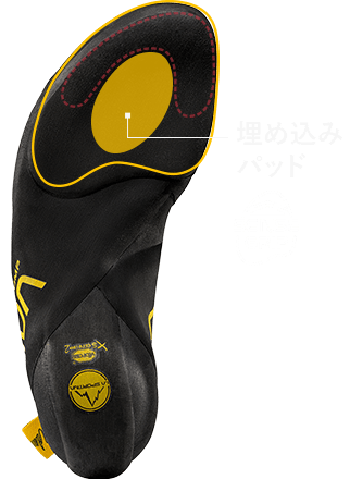 クライミング中に体重を支える前足部のサポート性を高めながら、スメアリングやエッジングで必要な中側部以降の屈曲性と柔軟性を確保。