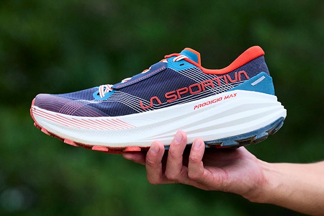スポルティバ史上最高レベルのクッション性を備え、長くて過酷な山岳ランに対応するのが「プロディジオマックス」だ。