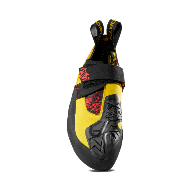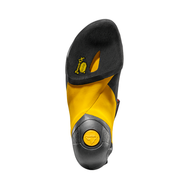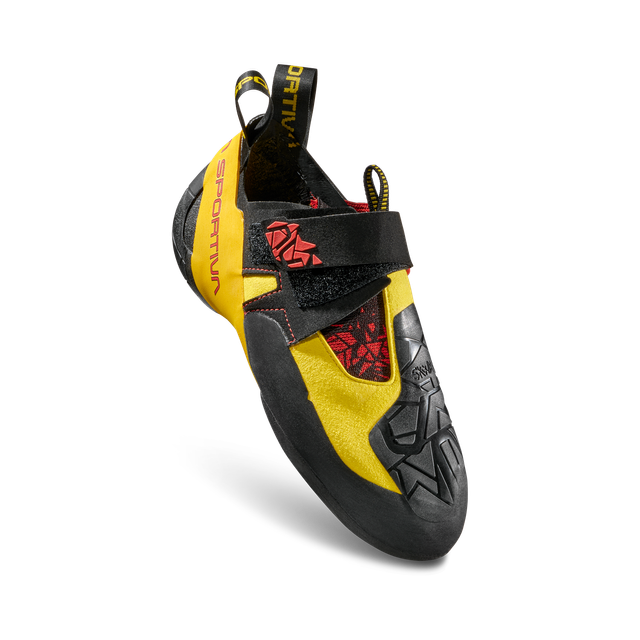 高い足技を持つクライマーは、ホールドを足で掴むように登るため、スクワマのソールに入った三角のスリットはつま先の自由度を高めてホールドをキャッチしやすい構造に。また、柔軟性の高さからスメアリングにも適しており、ハリボテにベタっと足を置いても安定し様々なフットワークに対応する。踵部には新採用のテクノロジー「Sヒール」を搭載したハイパフォーマンスモデル。