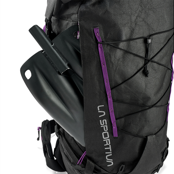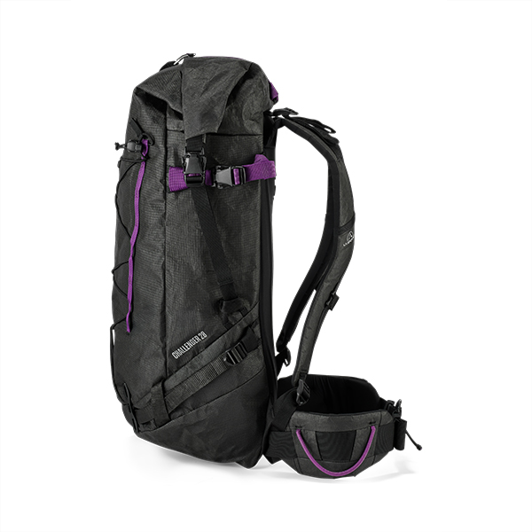 実用的なロールトップ式のチューブ構造により、容量を28リットルから32リットルに増やすことができ、ギアを多く積むミッションにも対応可能。メインコンパートメントはドローストリングで2つのセクションに分かれており、整理整頓が簡単に。両サイドには撥水ジッパーが付いており、取り外し可能な外部ストラップとコードを使えば、ロープ、スキー、ピッケル、ヘルメットなどを運ぶことができ、氷壁を登る時も、パウダースノーを滑る時も、自分に合った装備でセットアップできる。