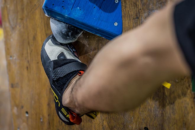エッジがないつま先は、広い面で壁に接地でき、マイクロホールドのような細かいスタンスにも立ち込める。