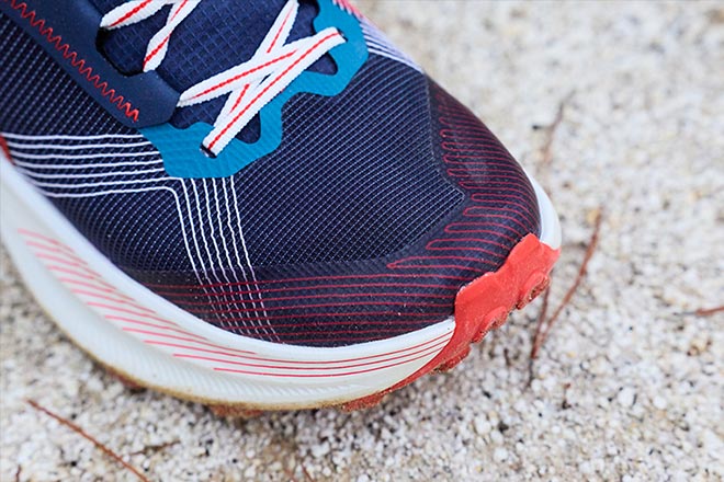 つま先はウルトラ向けのゆったりとしたラストで、足の圧迫感を抑え、長時間のランでも疲労を軽減。
