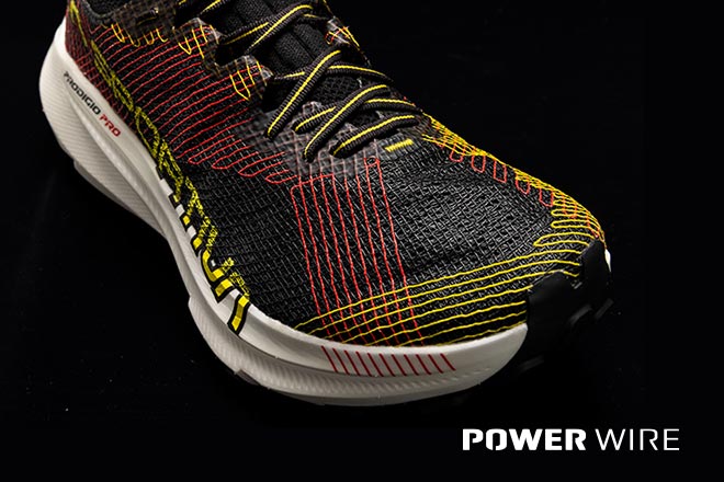 高い反発力とクッション性を両立したスピーディな推進力で、ショートからウルトラまでどんな距離でもベストパフォーマンスを発揮できるのが「プロディジオ プロ」だ。タフなアッパー素材と足首のニットカラーによって、岩との擦れや砂利の侵入を気にすることなく走りに集中できる。