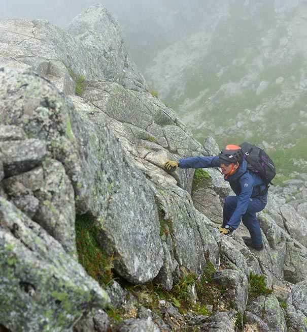 不安定な岩場、濡れた岩稜、長く続くアプローチ。登山者にとって過酷なシーンこそ、信頼できる足元が必要だ。