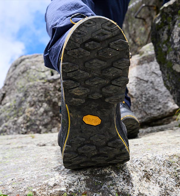 「Vibram® Megagrip」ソールと「Impact Brake System™」が、濡れた岩や不安定な下りでも優れたグリップと制動力を発揮する。