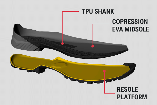 摩耗したソールを交換できる、スポルティバ独自の「Resole Platform™」構造を採用。足に馴染んだシューズの寿命を延ばしながら、環境への負荷も軽減する。